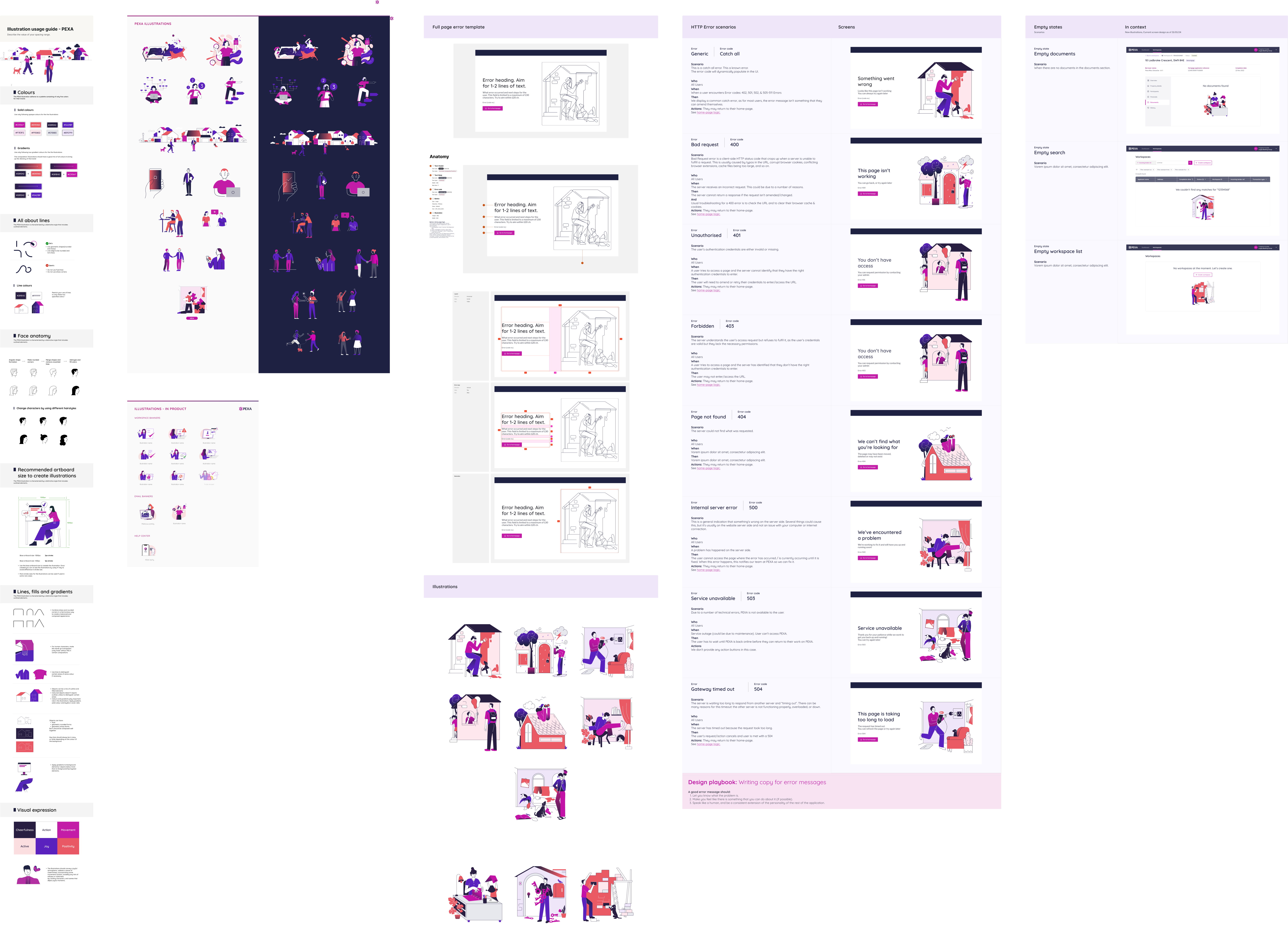 Custom visuals and copy for each error code keep users informed, provide clear feedback, and offer paths to recover or resolve issues. Covers common web error codes.